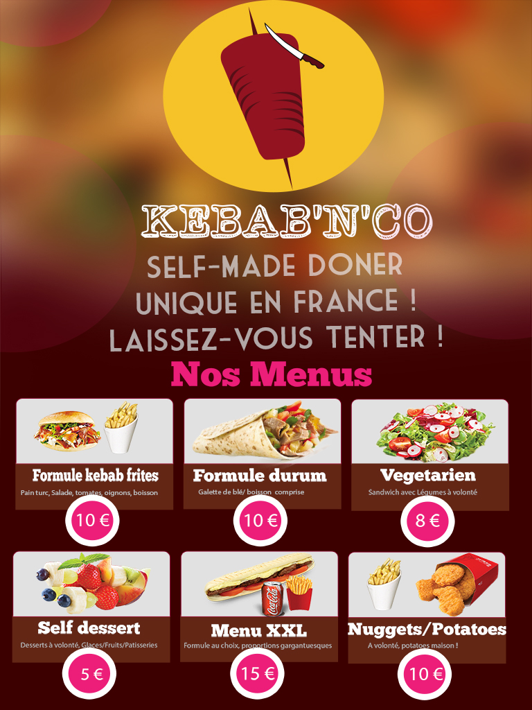 Kebab'N'Co est une idée imaginée dans le cadre d'un projet individuel dont le but était de créer de toute pièce un concept innovant composé d'une campagne de communication (flyer, carte de visite, affiche) ainsi que d'une campagne marketing (dossier contenant analyse du marché, analyse MOFF, différentes stratégies d'implantation)